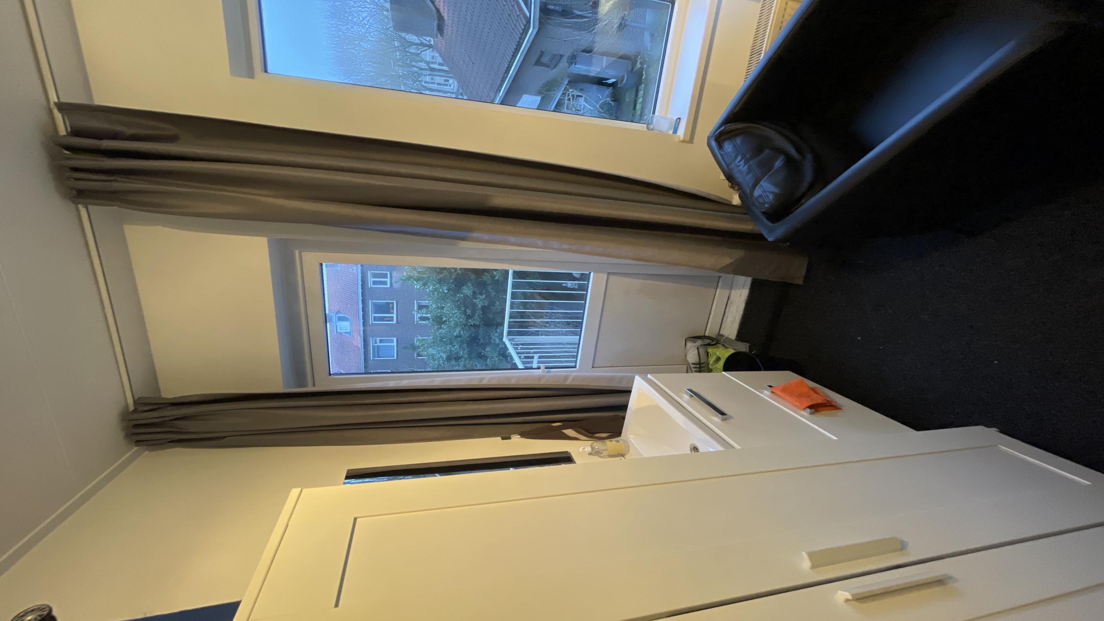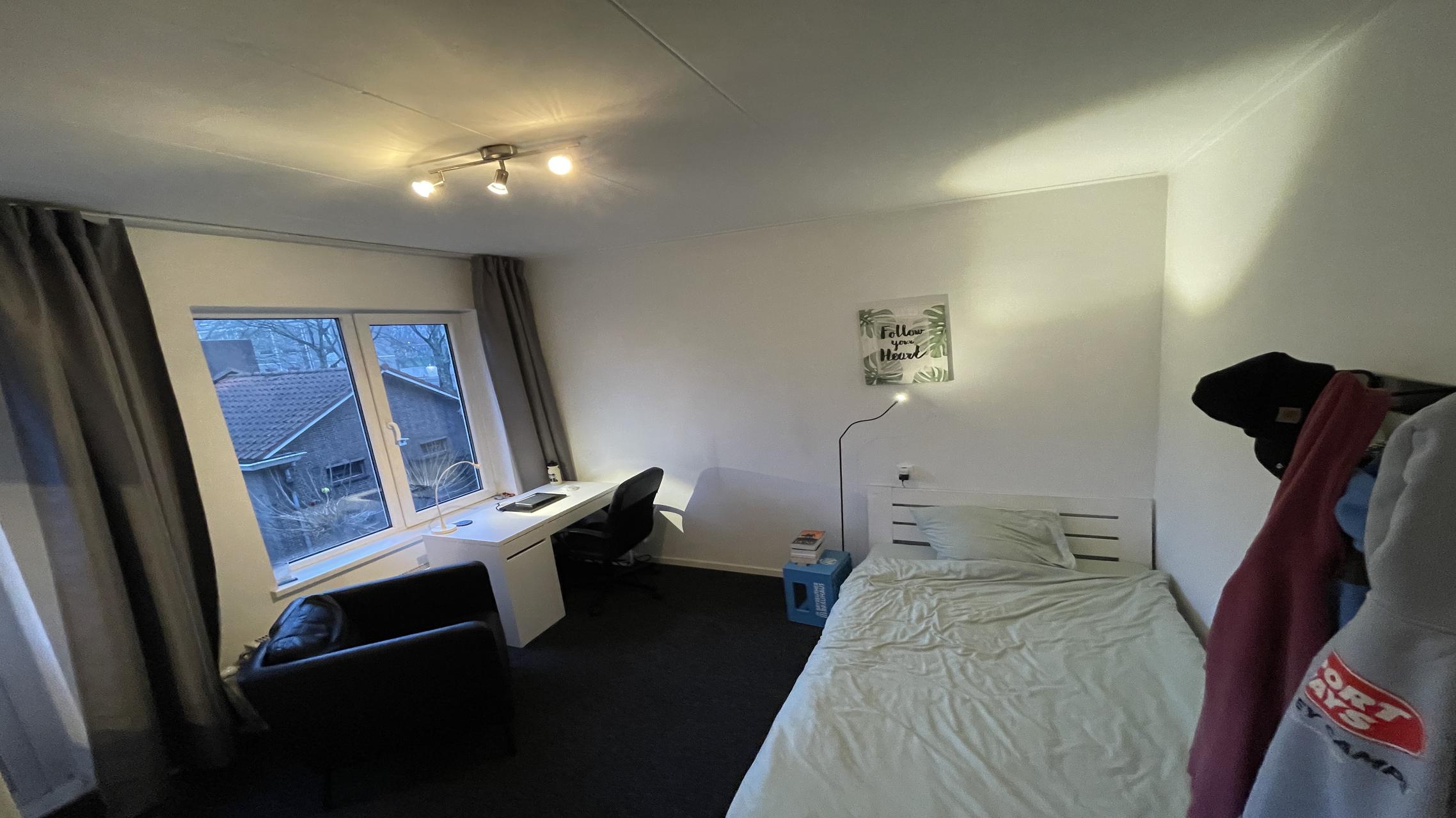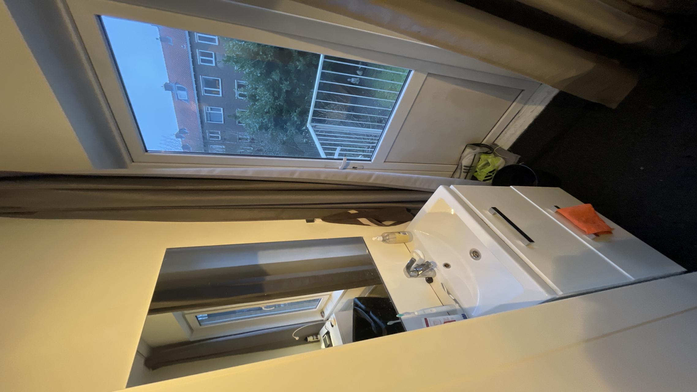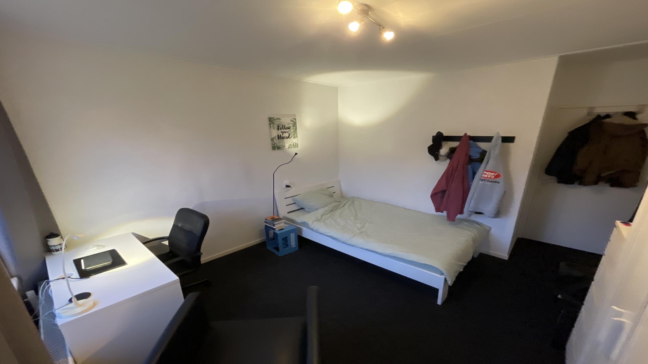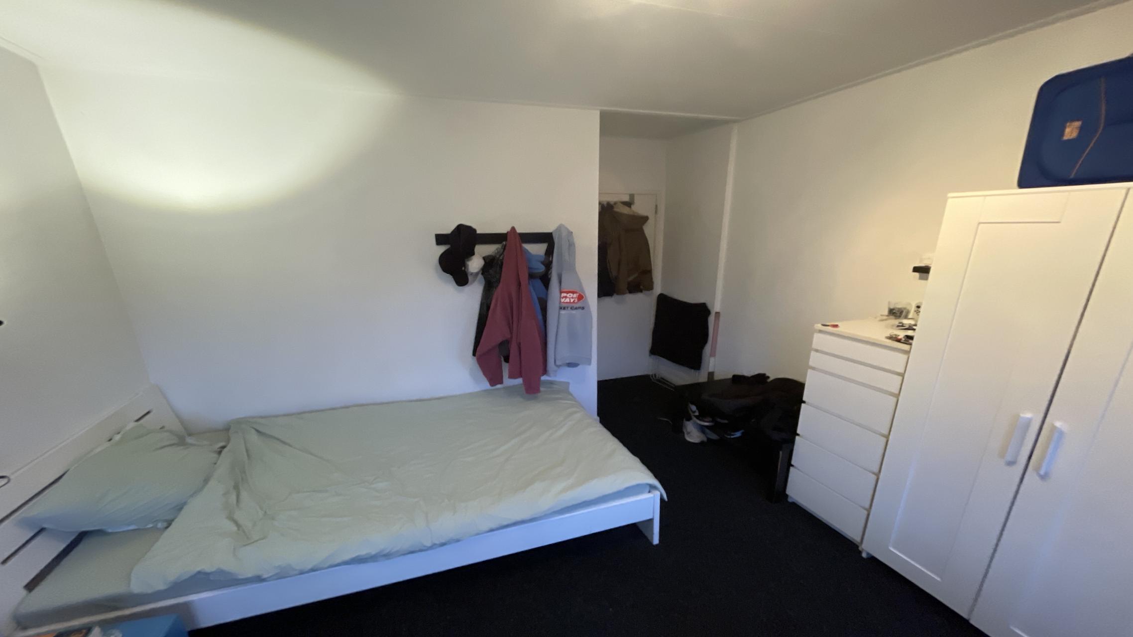 This fully furnished student room comes with a bed, desk, chair, wardrobe, cupboard, and a wash basin with hot and cold water. The shared facilities include a fully equipped kitchen with a dishwasher and washing machine, as well as a bathroom, shared with two other tenants (male). The rent includes gas, electricity, water, and internet, with local taxes excluded.